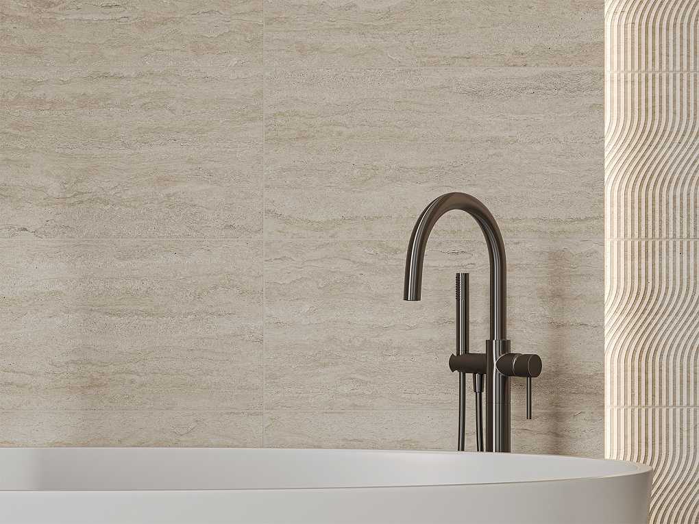 Матовая поверхность плит сохраняет естественную текстуру травертина и подчеркивает благородство материала. Цветовая гамма представлена двумя светлыми оттенками — молочным и бежевым, обеспечивая визуальную легкость и комфорт восприятия.