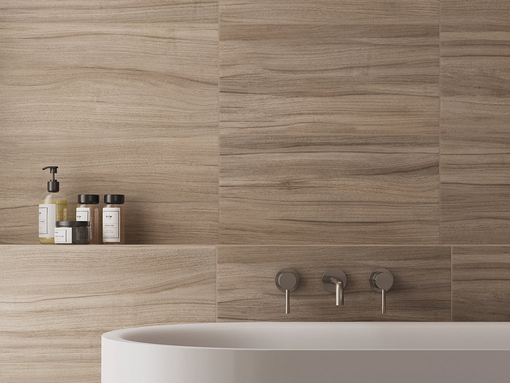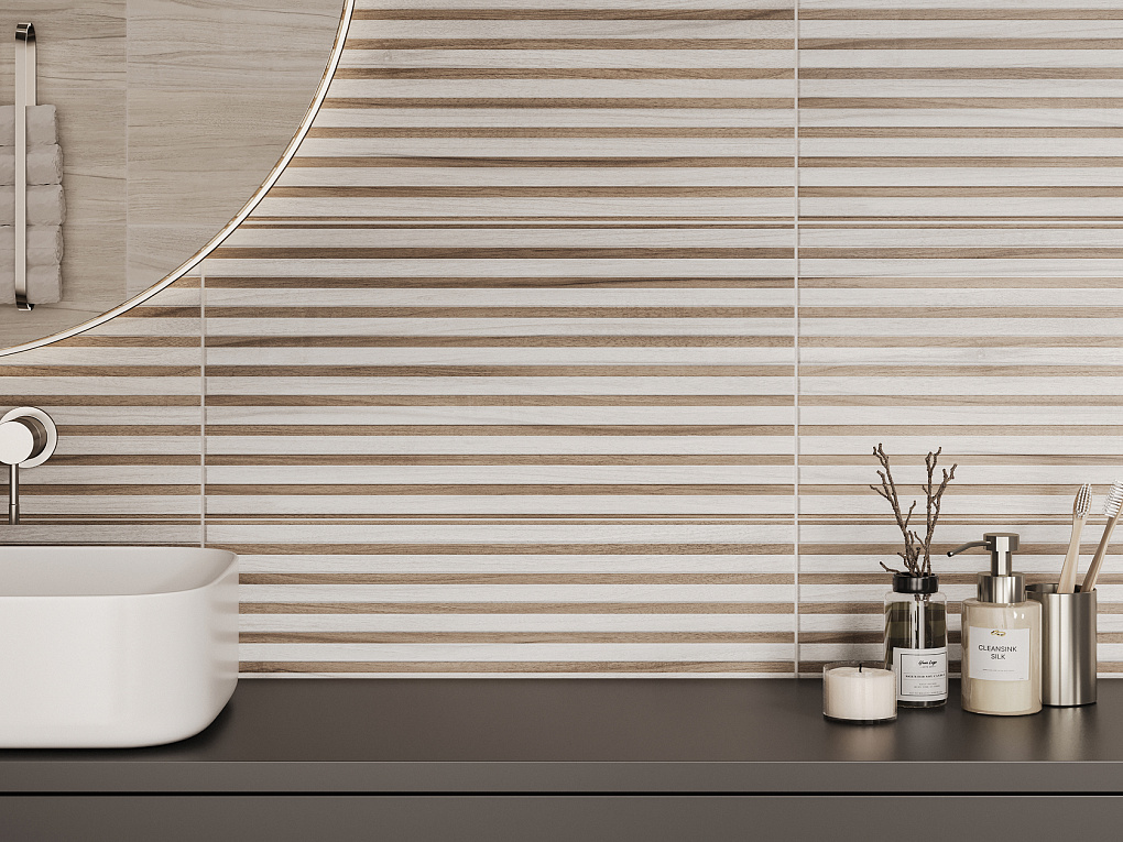 Материал здесь играет главную роль: натуральное дерево — единственный герой коллекции. Оно представлено в бежевых и коричневых оттенках и разных фактурах, подчеркивающих аутентичность и богатство природного материала.