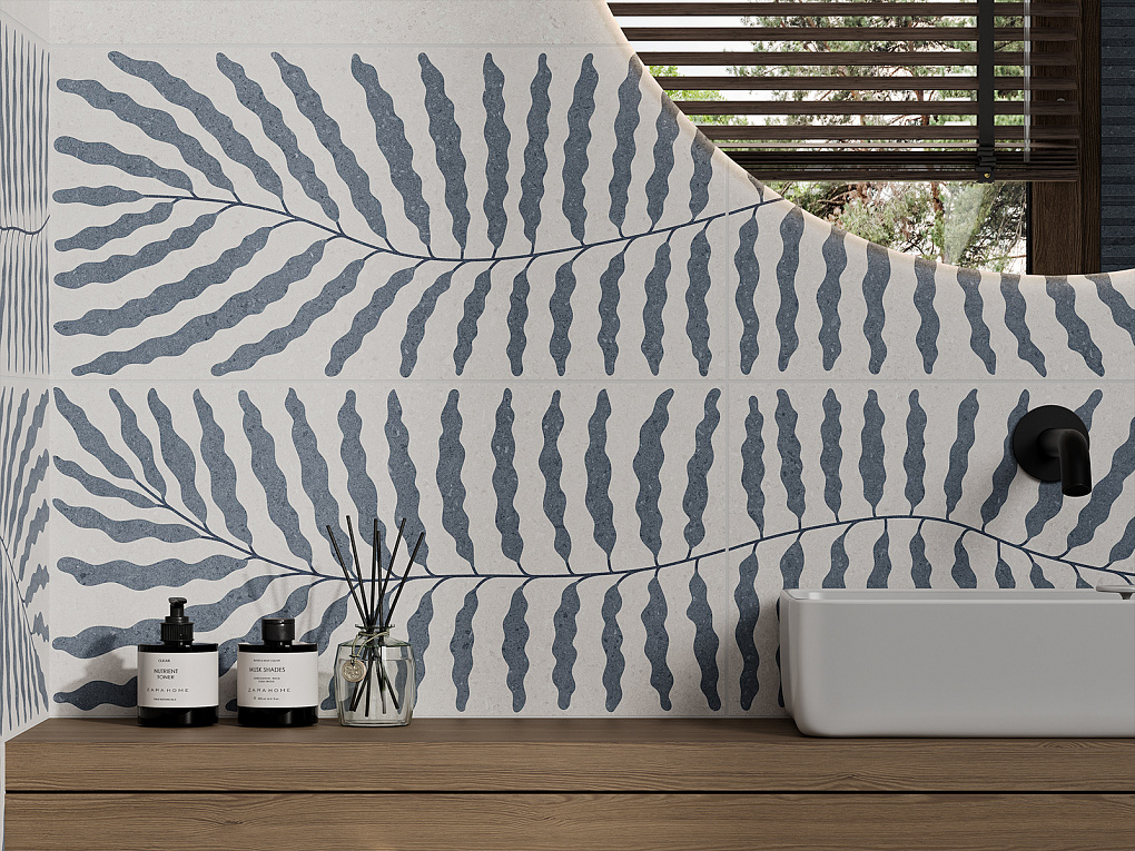 Матисс — это ритм, линия и лёгкость. В основе коллекции — светлая бетонная плита и рельеф глубокого сине-серого оттенка. Акцент — мягкий флористический рисунок с графичными листьями, расположенными асимметрично, создавая иллюзию живого танца линий, отсылающими к вырезкам Матисса.