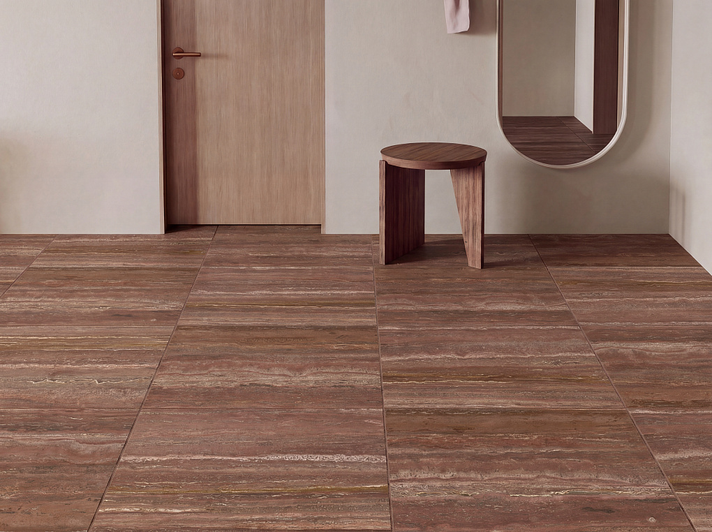 Плиты, выполненные в текстуре натурального травертина, привлекают своим глубоким коричневым цветом, раскрывая слоистую структуру натурального камня.