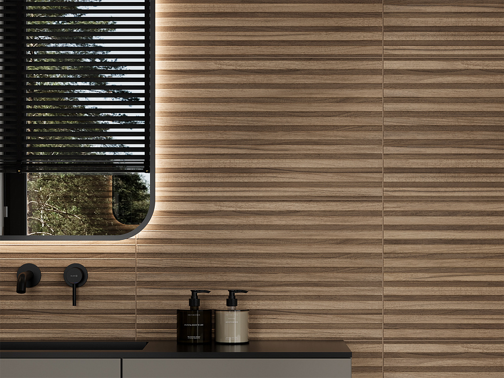 Визуальный язык коллекции Токио строится на контрасте фактур: белый глянцевый мрамор с тёплыми прожилками соседствует с тонким вертикальным рельефом и рельефом горизонтальных реек с текстурой дерева — тёплого, тактильного, «живого». Здесь важна не только форма, но и ощущение покоя, уюта и естественного ритма.