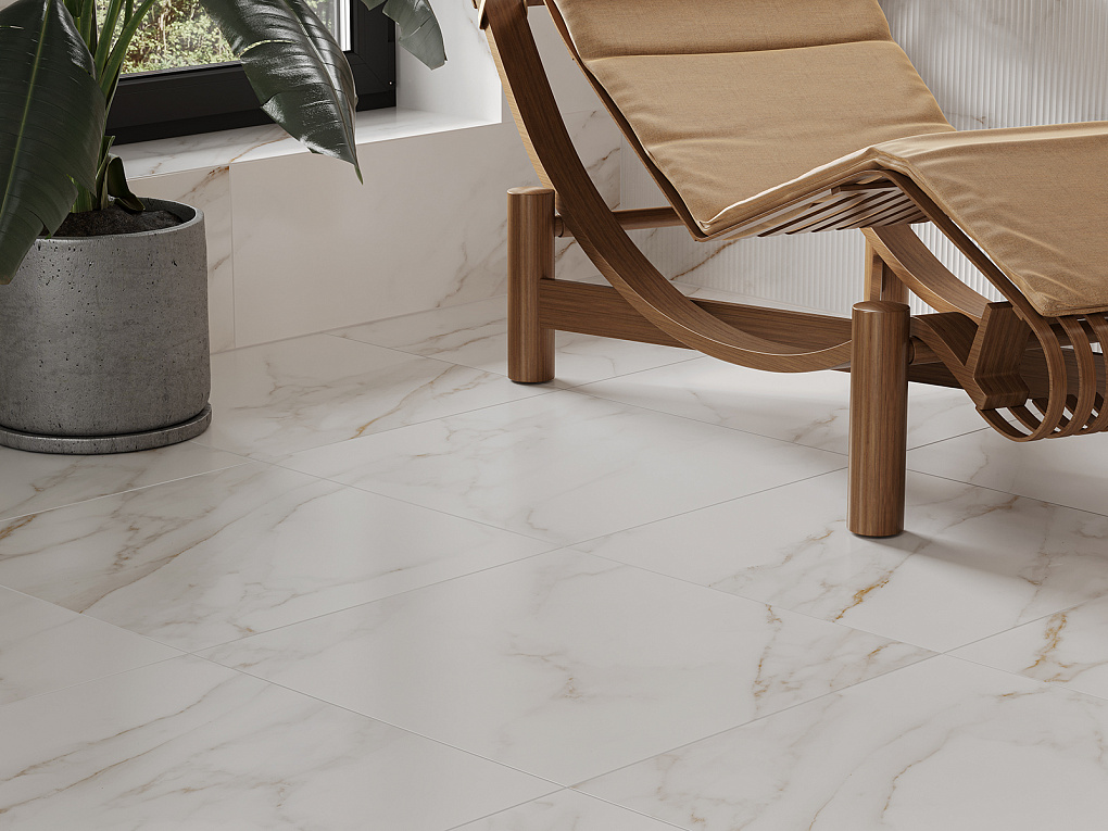 В дополнение к настенным плитам — напольный керамогранит двух природных текстур: дерева и белого мрамора с теплыми бежевыми прожилками.